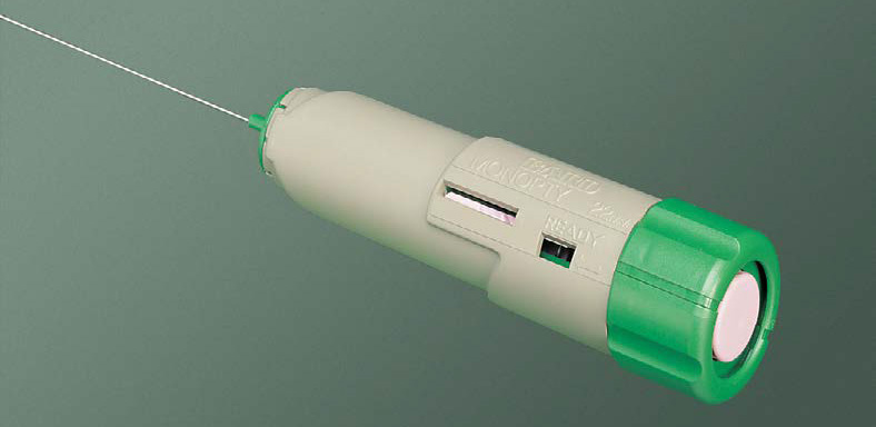 結(jié)構(gòu)及組成:一次性活檢針由手柄和活檢針組成,手柄由樹脂和熱塑性彈性體構(gòu)成,活檢針由304不銹鋼穿刺針和同心套管組成。套管上有厘米刻度標(biāo)識(shí)。手柄旁側(cè)和后部的傳動(dòng)按鈕按照不同的規(guī)格大小用不同顏色標(biāo)出:黃色=20G、粉紅色=18G、紫色=16G、綠色=14G。