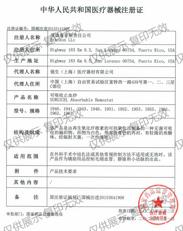 適用范圍:在外科手術(shù)中結(jié)扎法或其他常規(guī)控制方法不適用或無效時(shí),該產(chǎn)品作為輔助用品控制毛細(xì)血管、靜脈和小動(dòng)脈的出血。