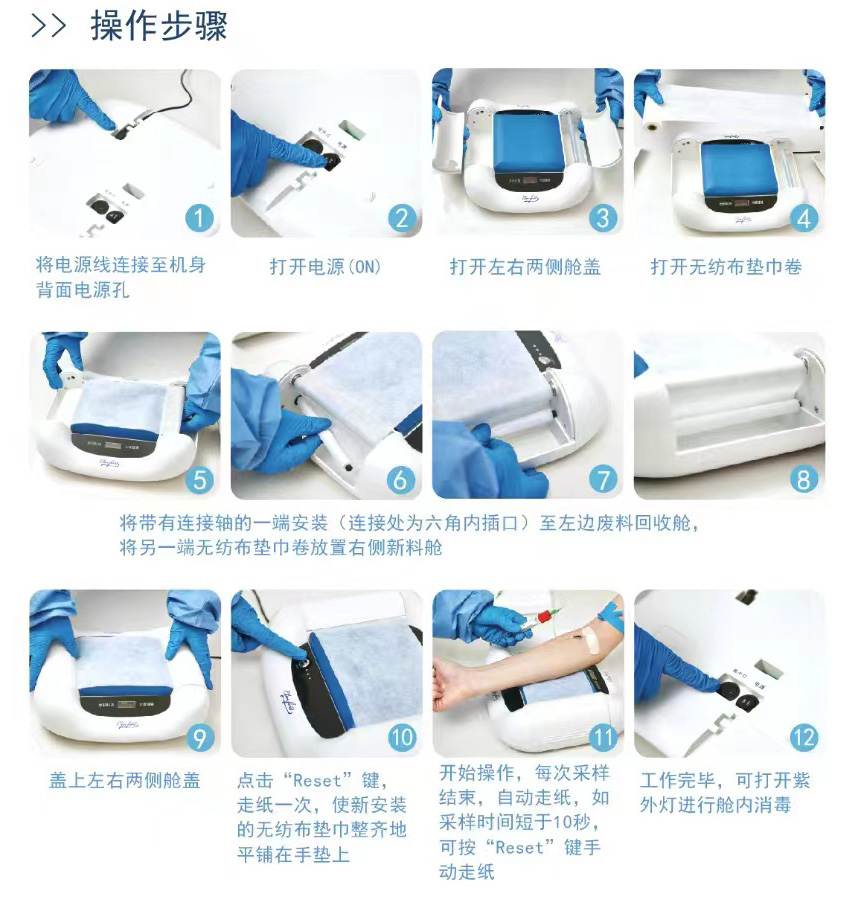 Clin First智能采血墊有自動和手動兩種模式,可依需選擇。自動模式下,設備自動更換一次性墊巾,方便快捷。一人一巾避免交叉接觸。內(nèi)置鋰電/直插電兩款選擇使用,鋰電使用提高續(xù)航時間,適合戶外流動作業(yè),方便靈活。