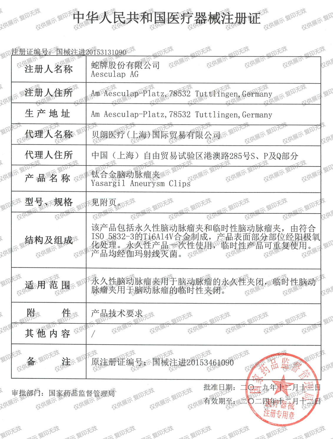 適用范圍:永*性腦動脈瘤夾用于腦動脈瘤的永*性夾閉,臨時性腦動脈瘤夾用于腦動脈瘤的臨時性夾閉。