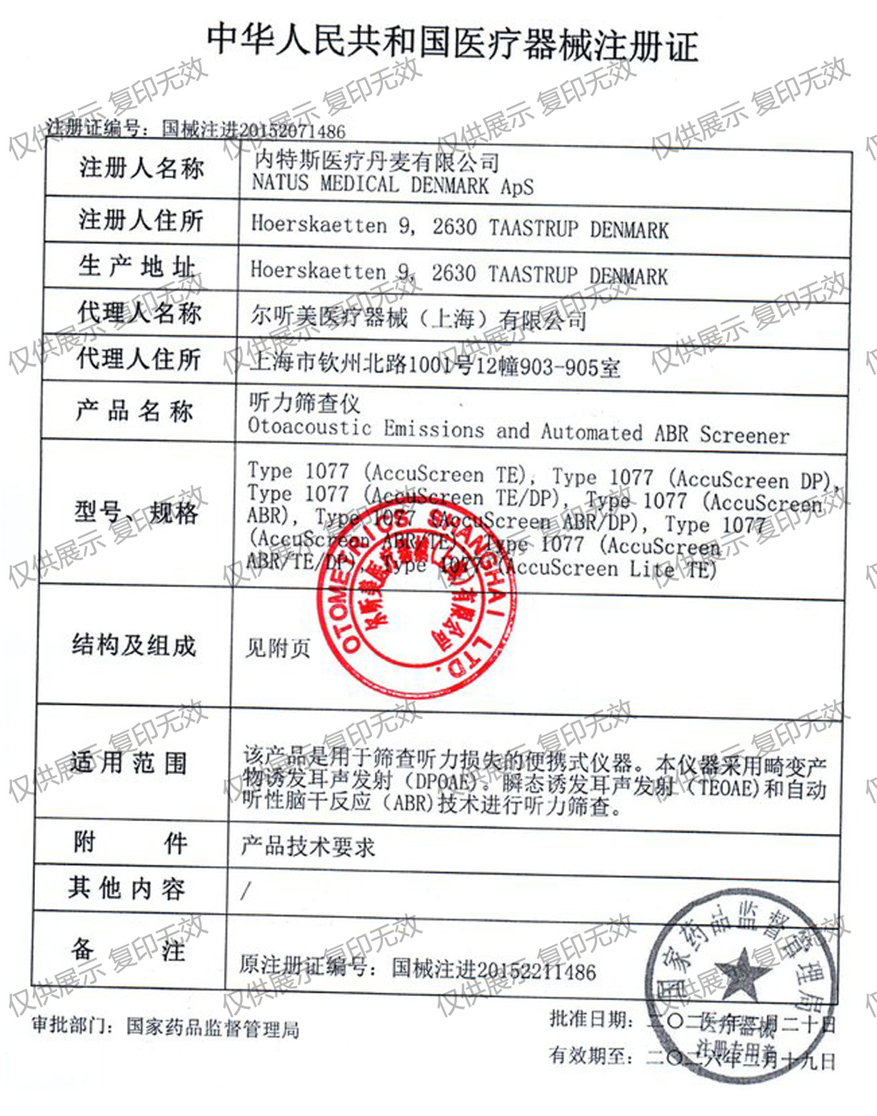 適用范圍:該產(chǎn)品是用于篩查聽(tīng)力損失的便攜式儀器。本儀器采用畸變產(chǎn)物誘發(fā)耳聲發(fā)射(DPOAE)。瞬態(tài)誘發(fā)耳聲發(fā)射(TEOAE)和自動(dòng)聽(tīng)性腦干反應(yīng)(ABR)技術(shù)進(jìn)行聽(tīng)力篩查。